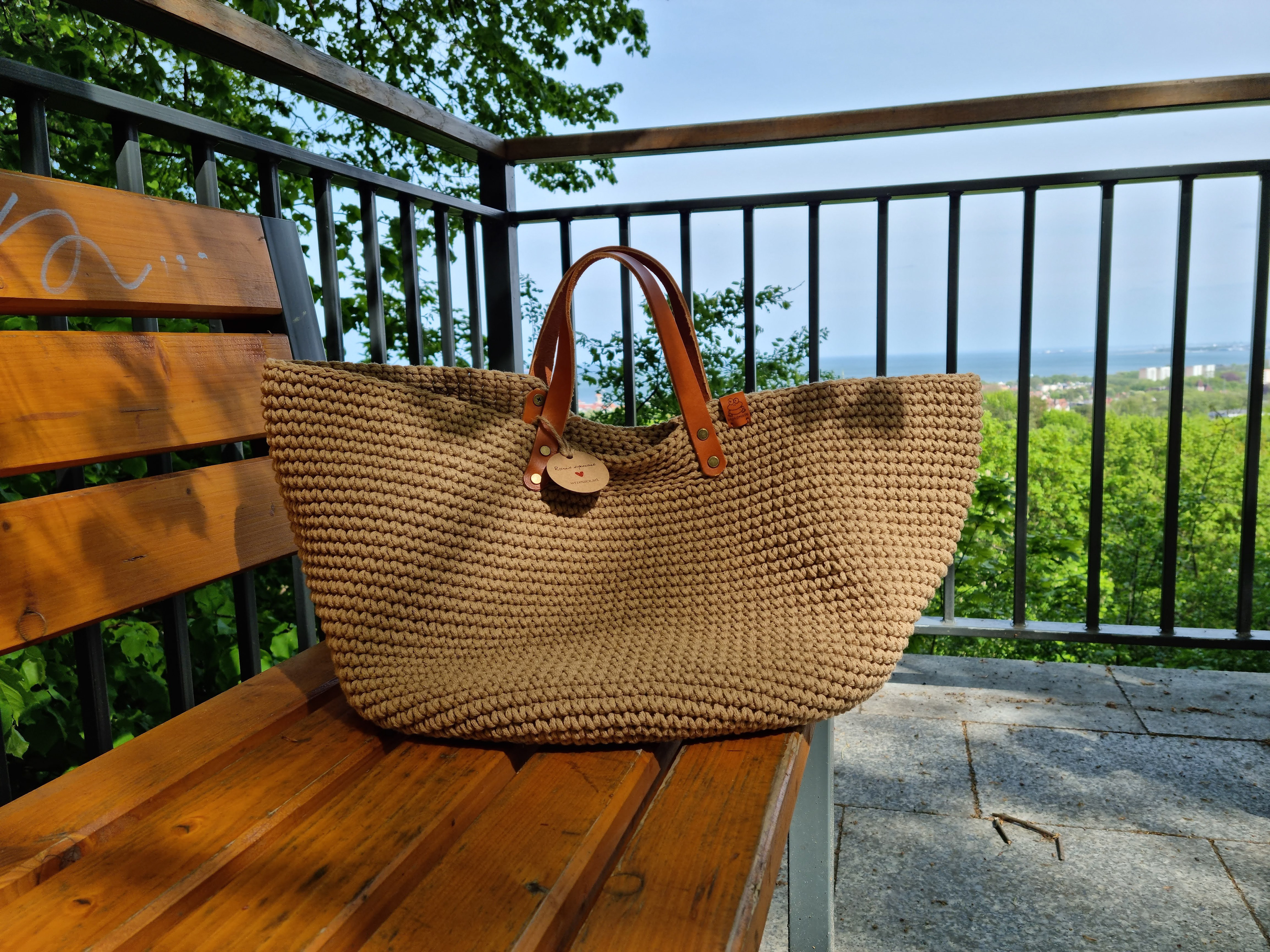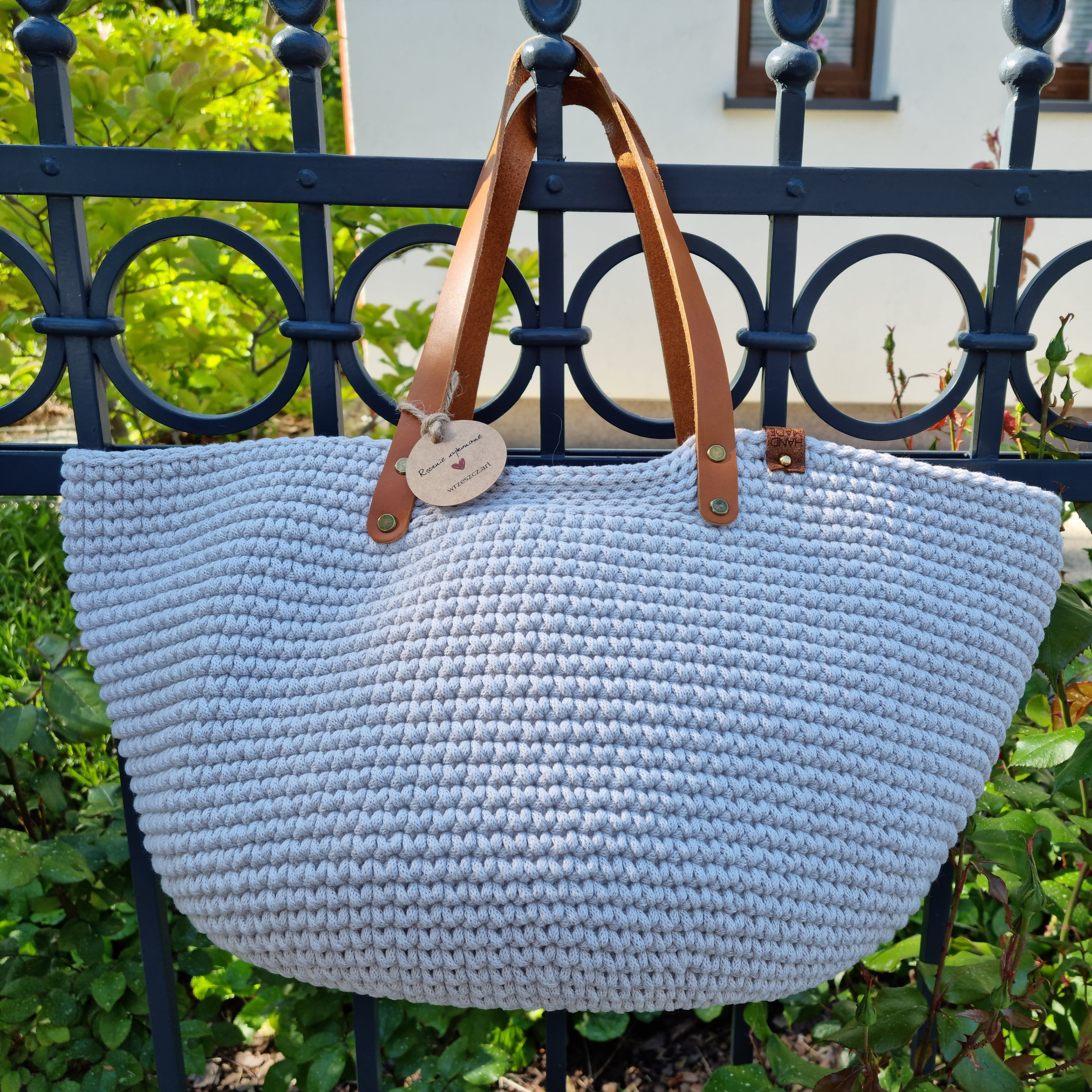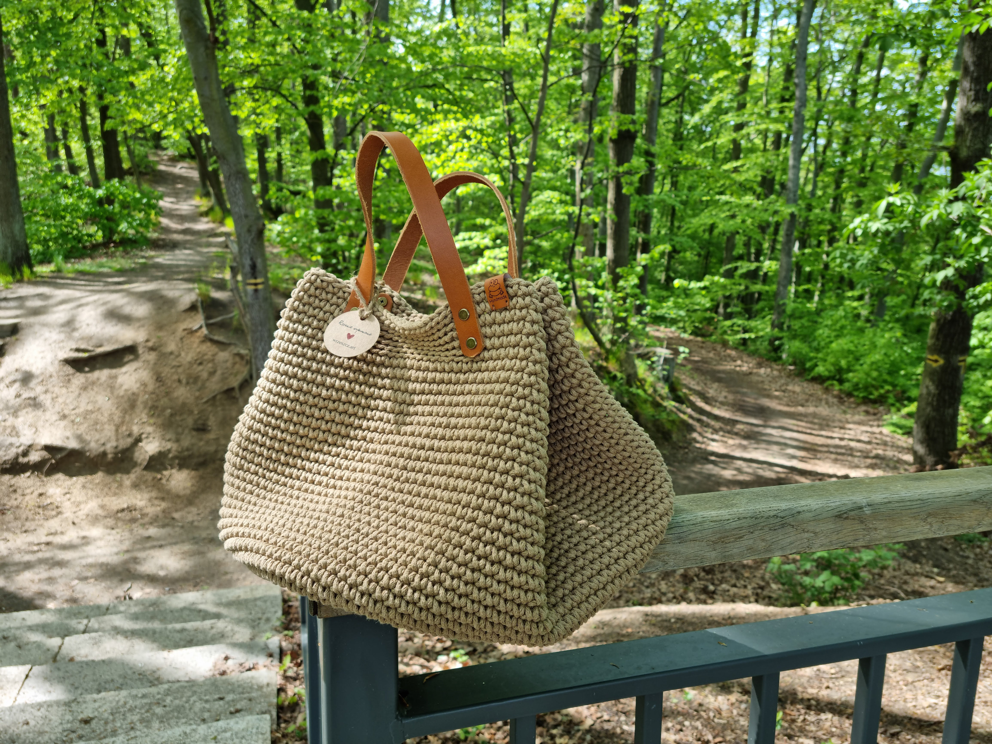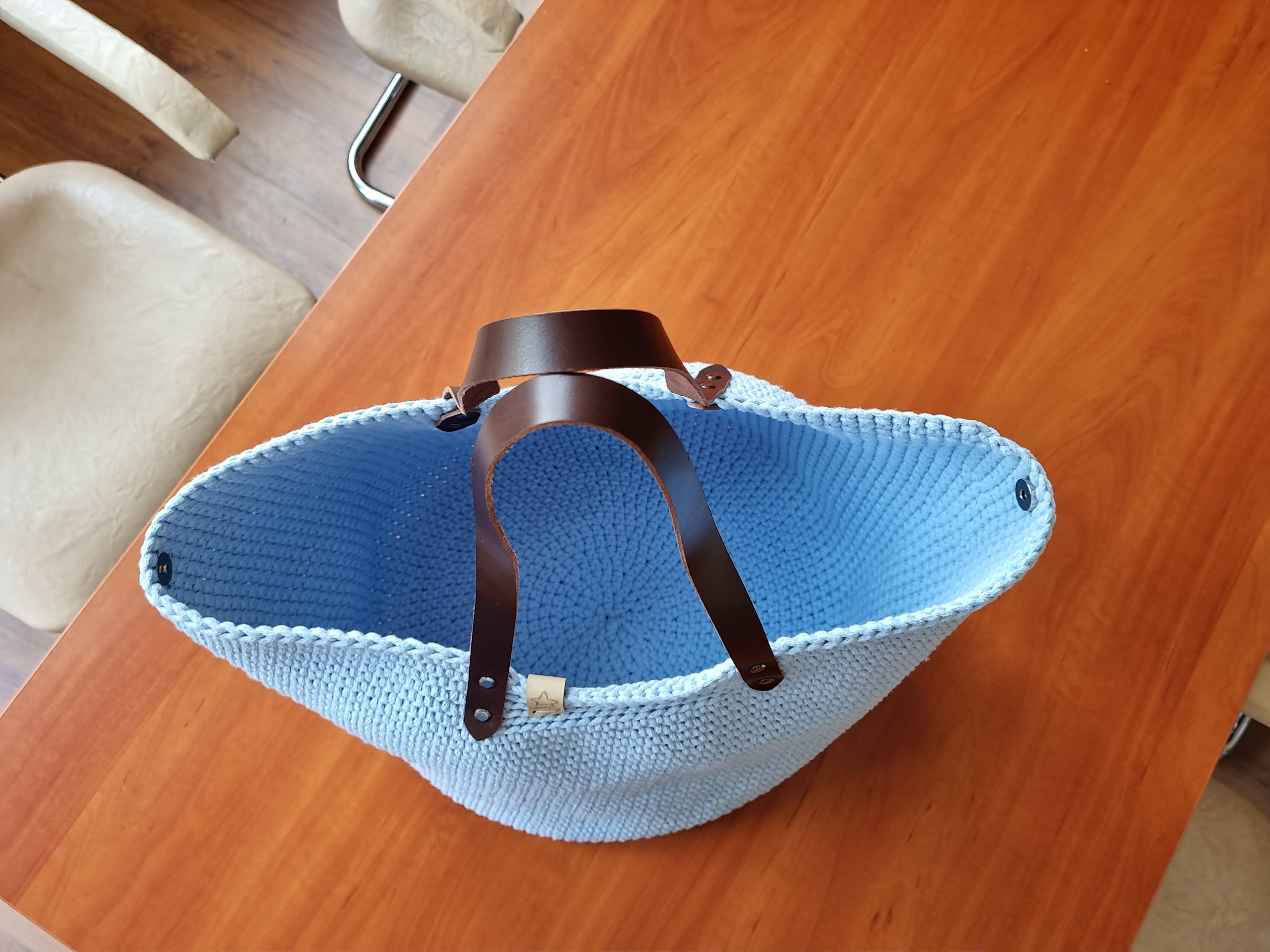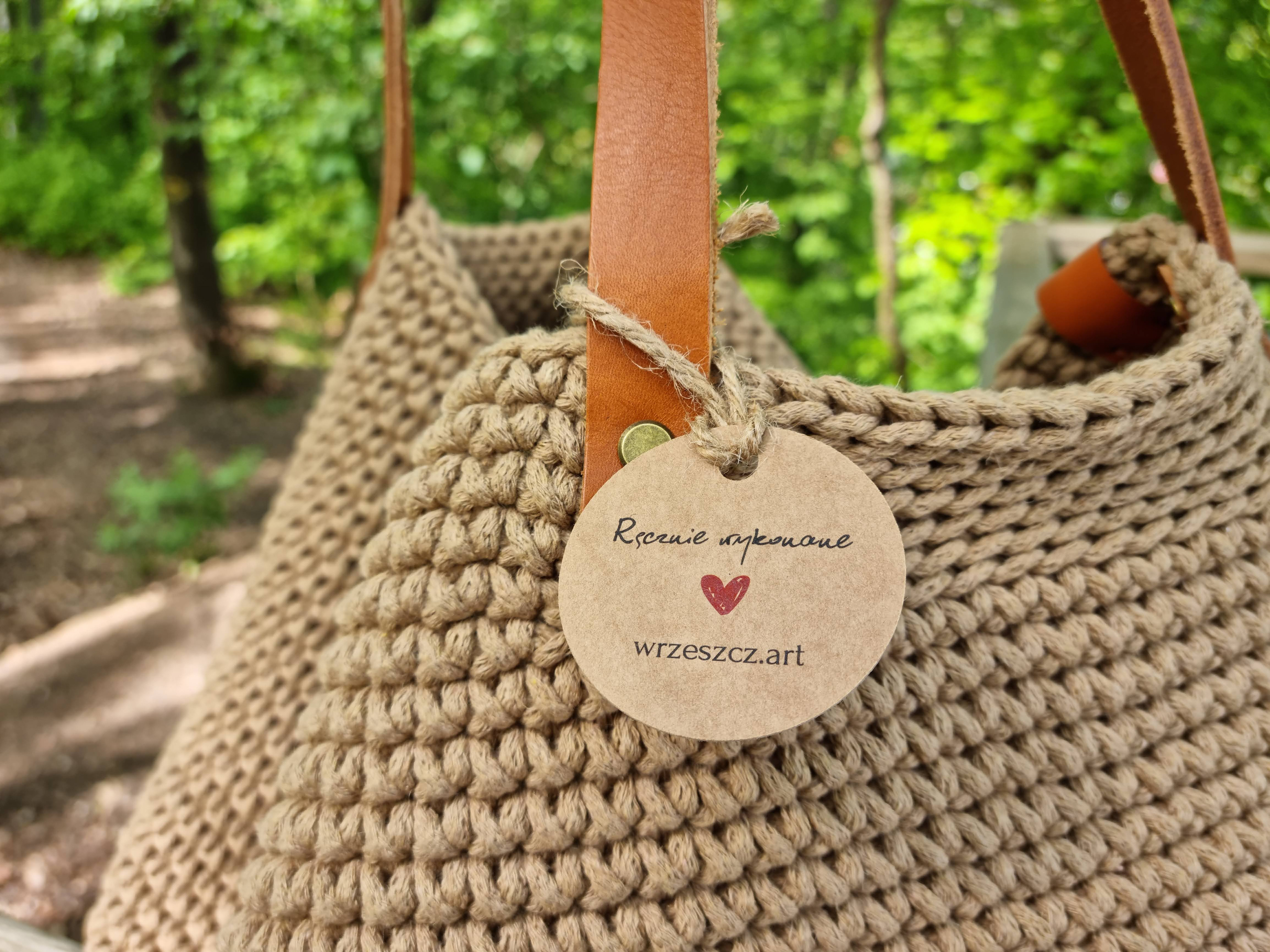 Ręcznie robiona ze sznurka bawełnianego 3 mm, z okrągłym dnem (38 cm) i szerokością u góry aż 60 cm – pomieści absolutnie wszystko.