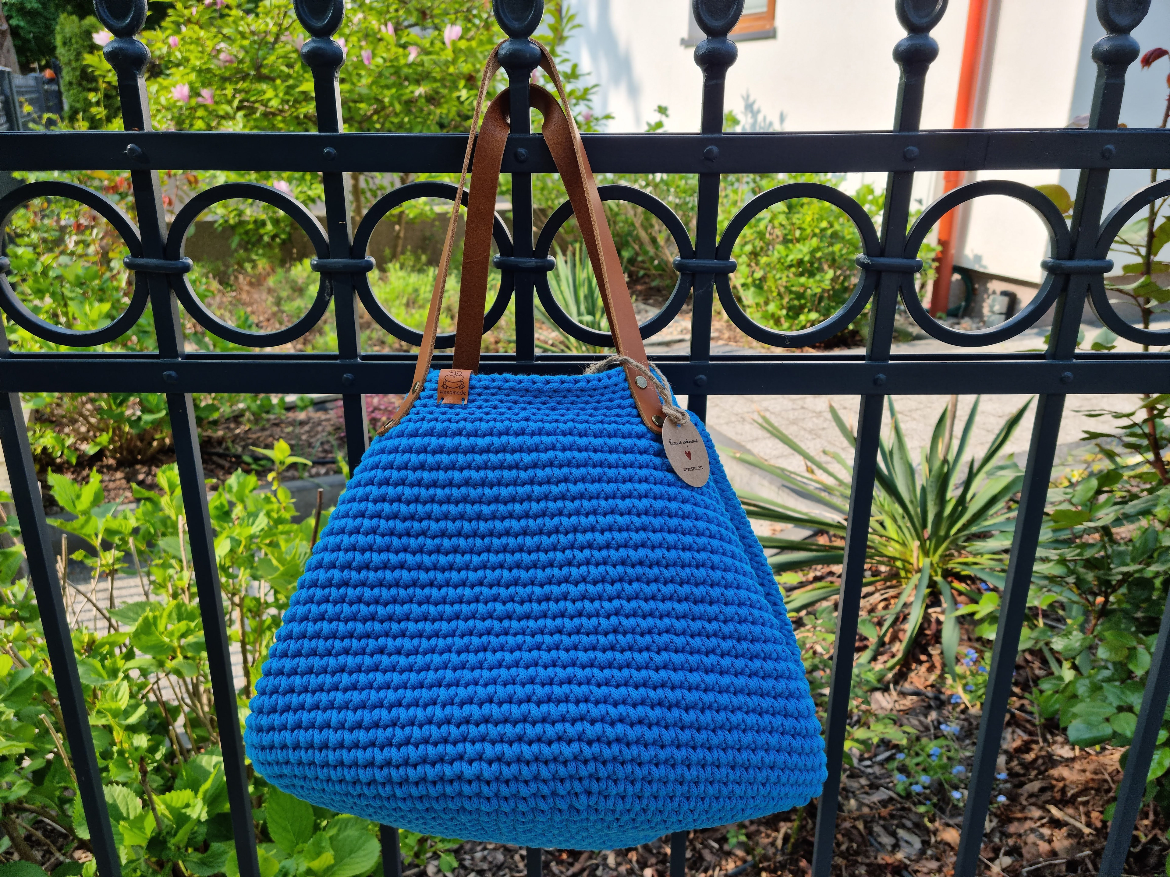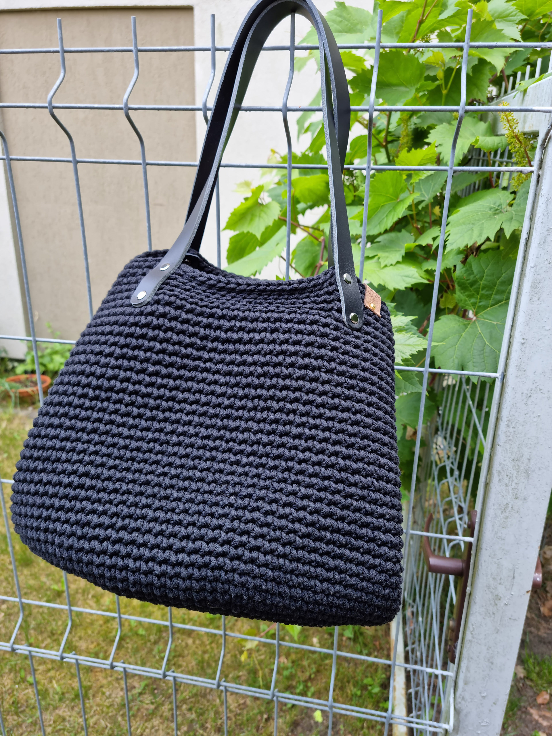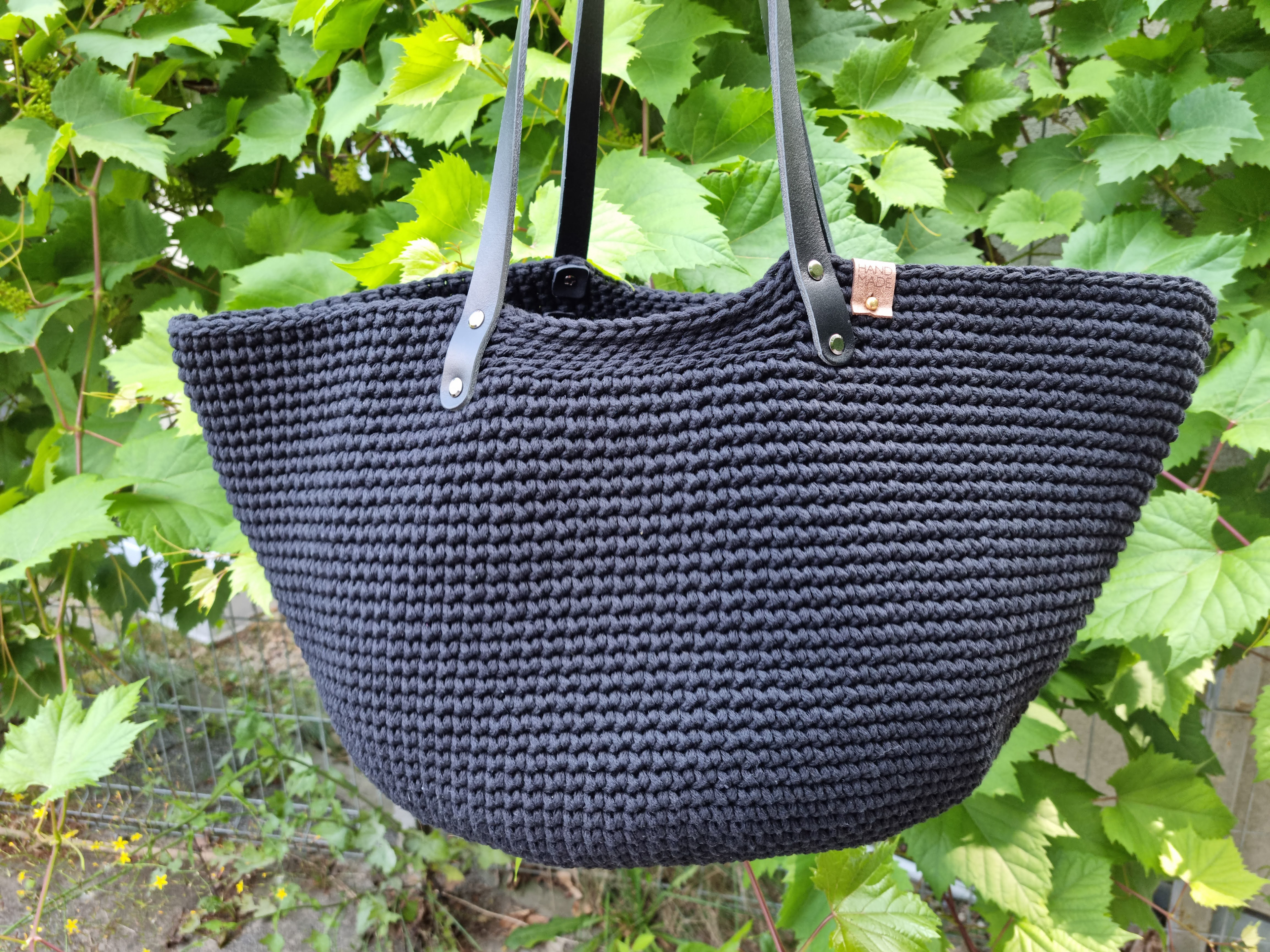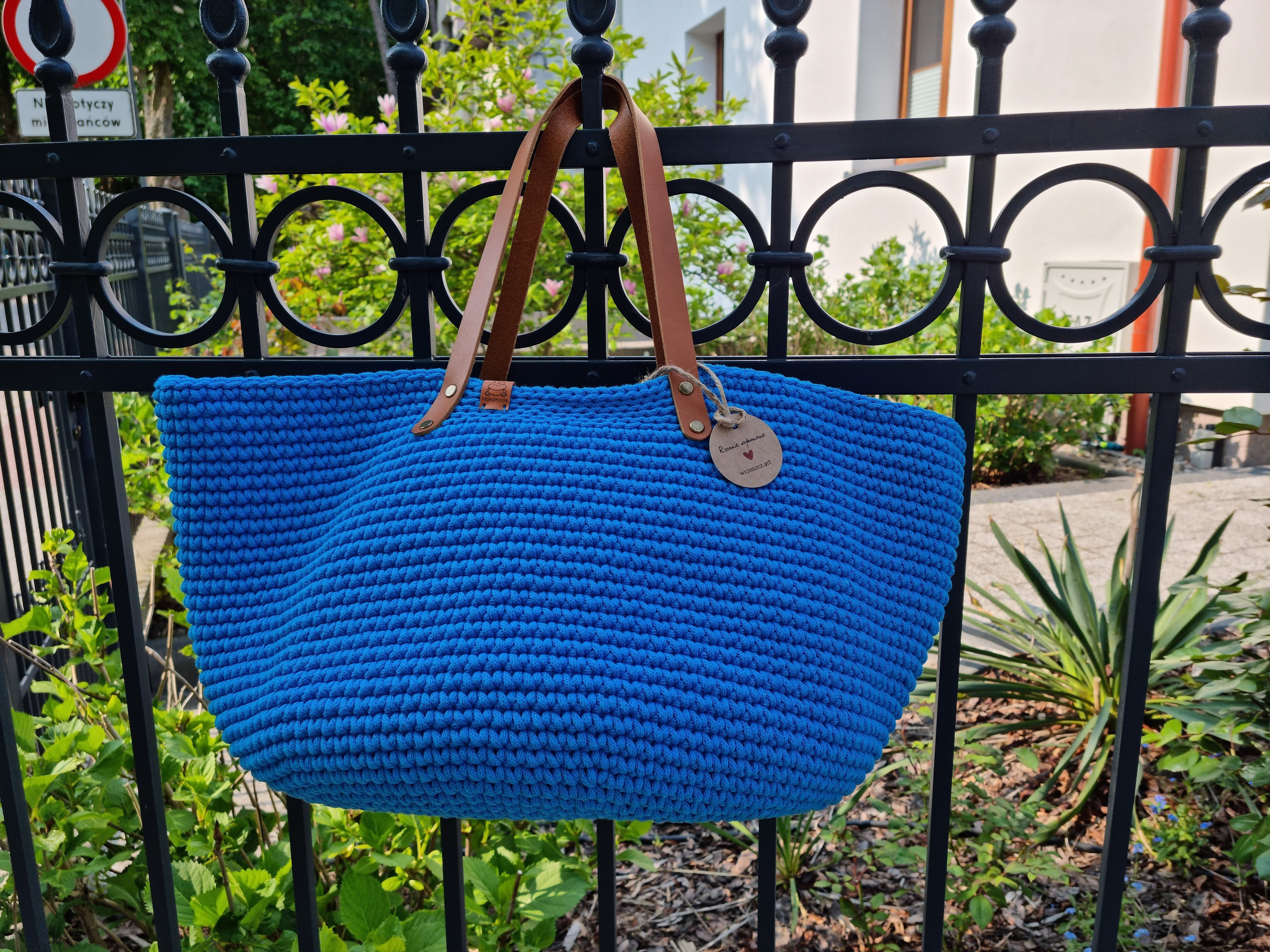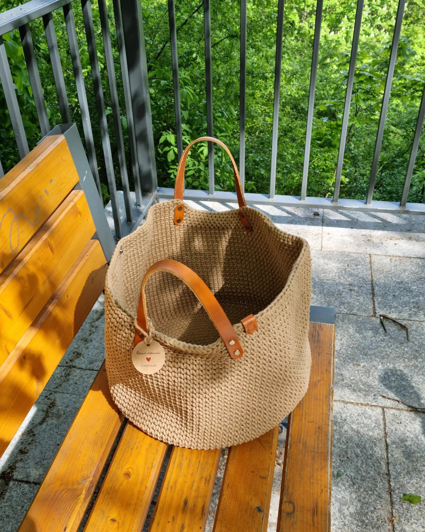 Ręcznie robiona ze sznurka bawełnianego 3 mm, z okrągłym dnem (38 cm) i szerokością u góry aż 60 cm – pomieści absolutnie wszystko.