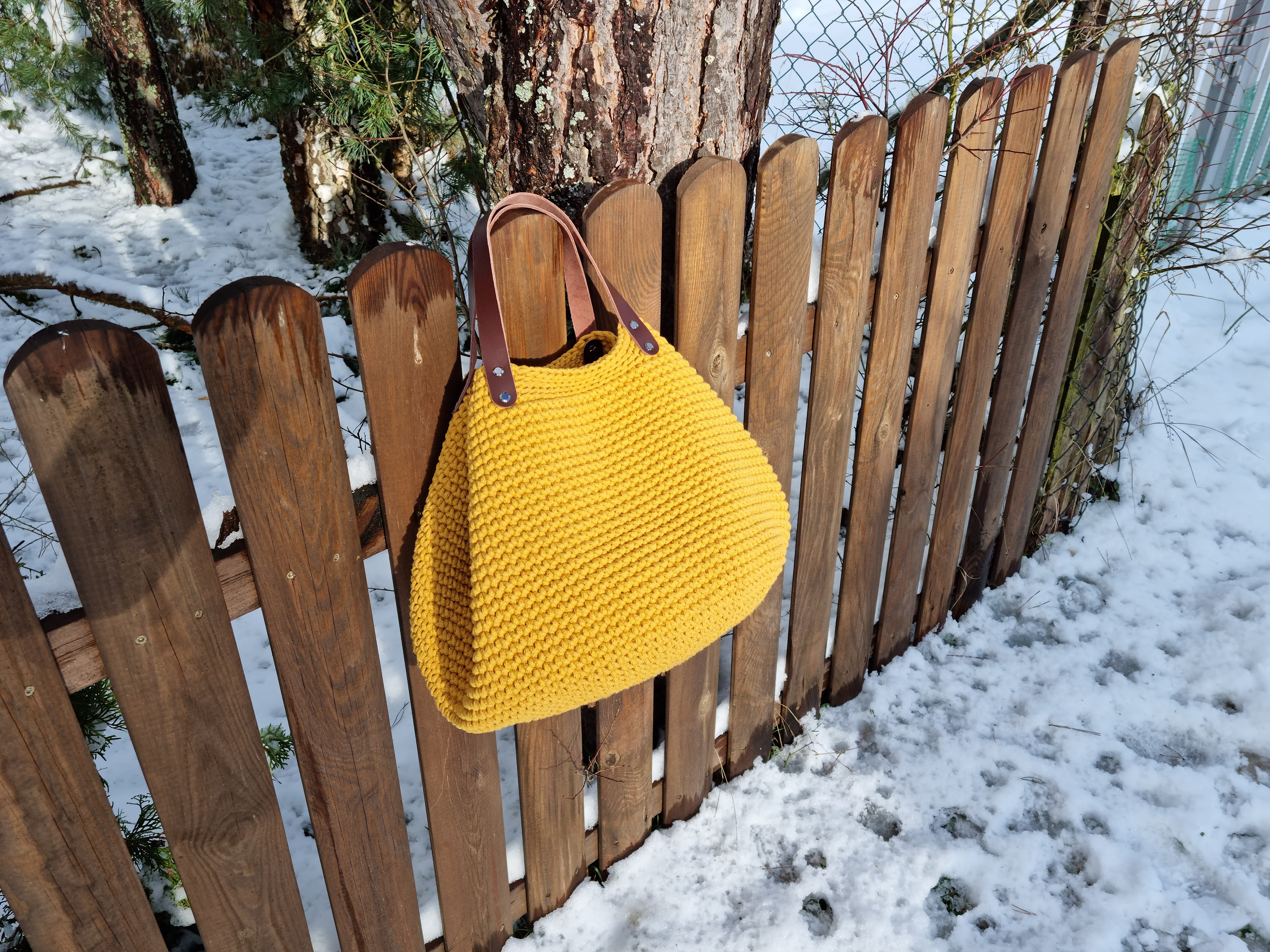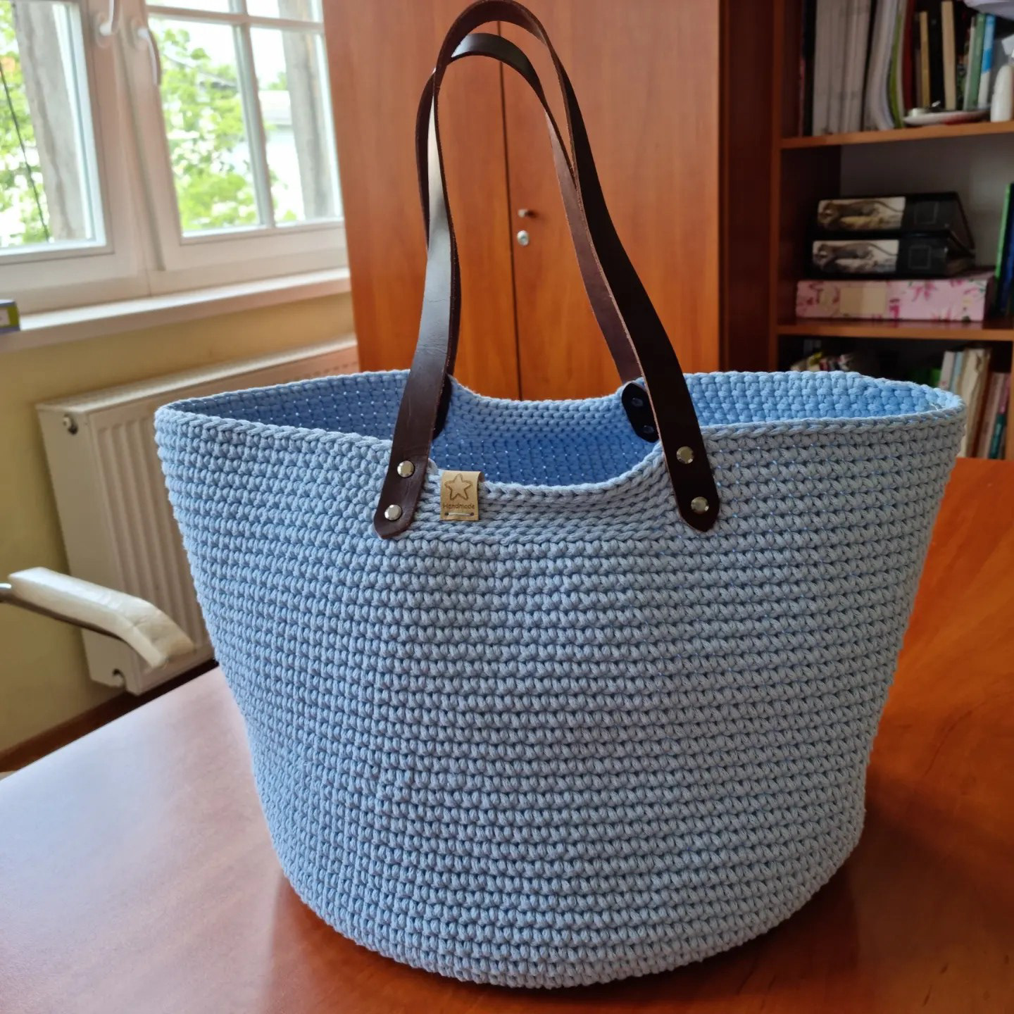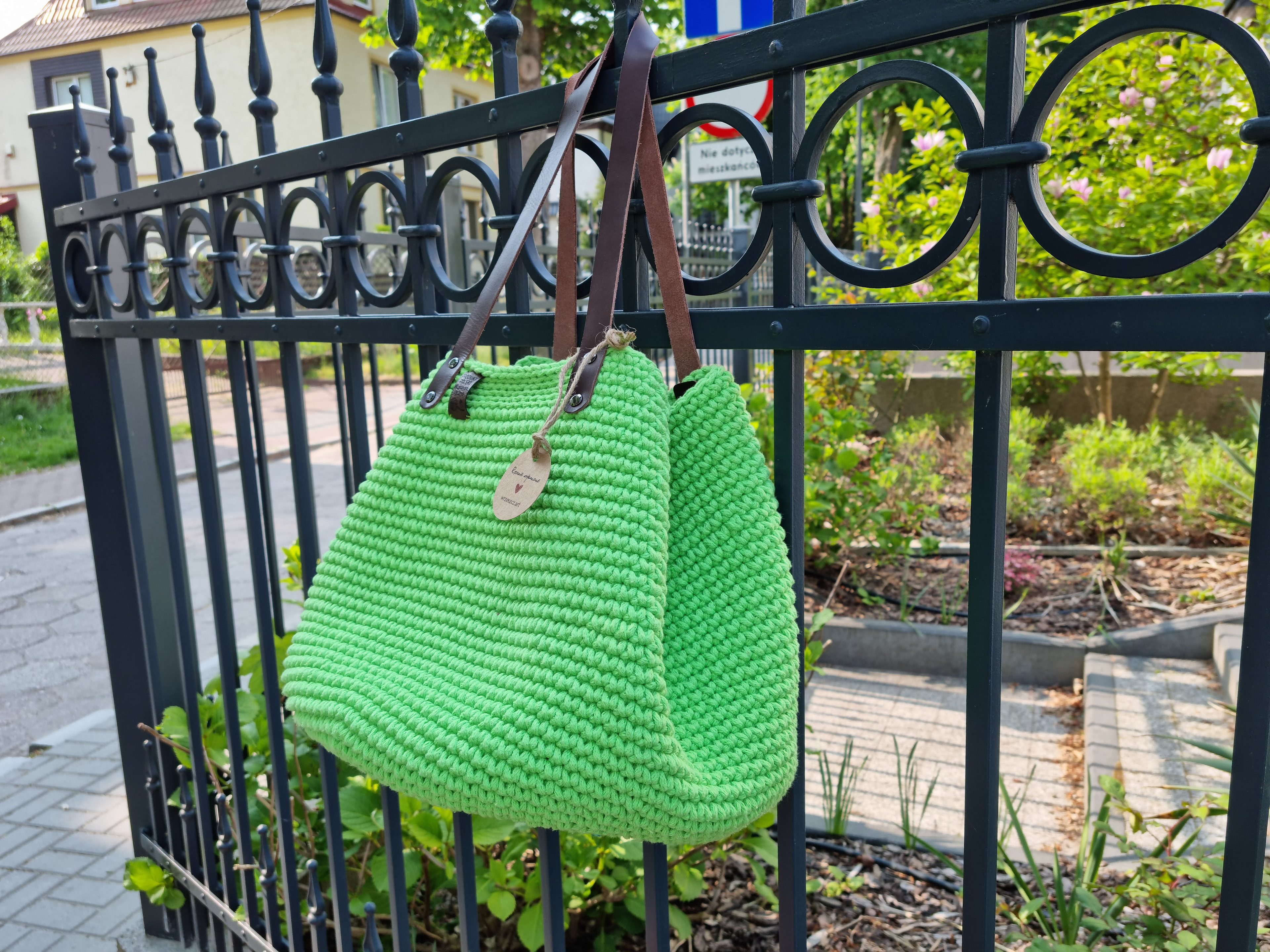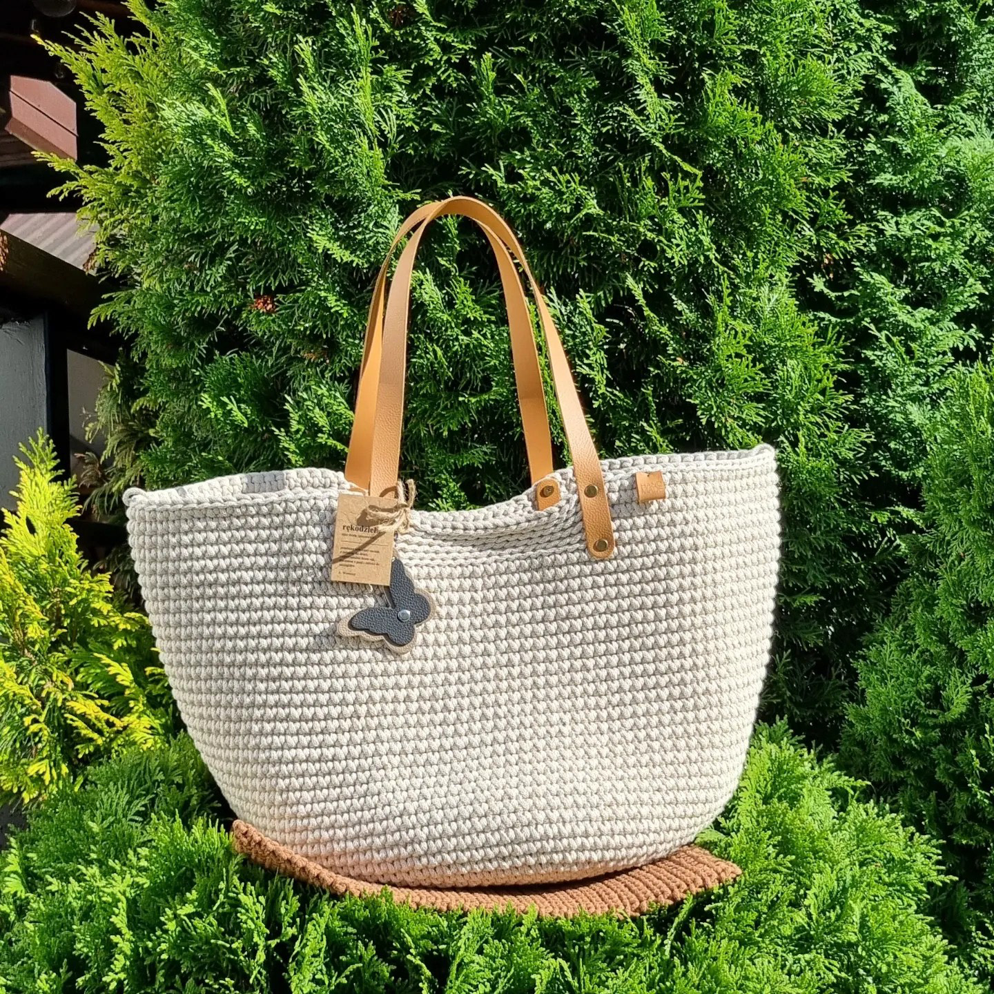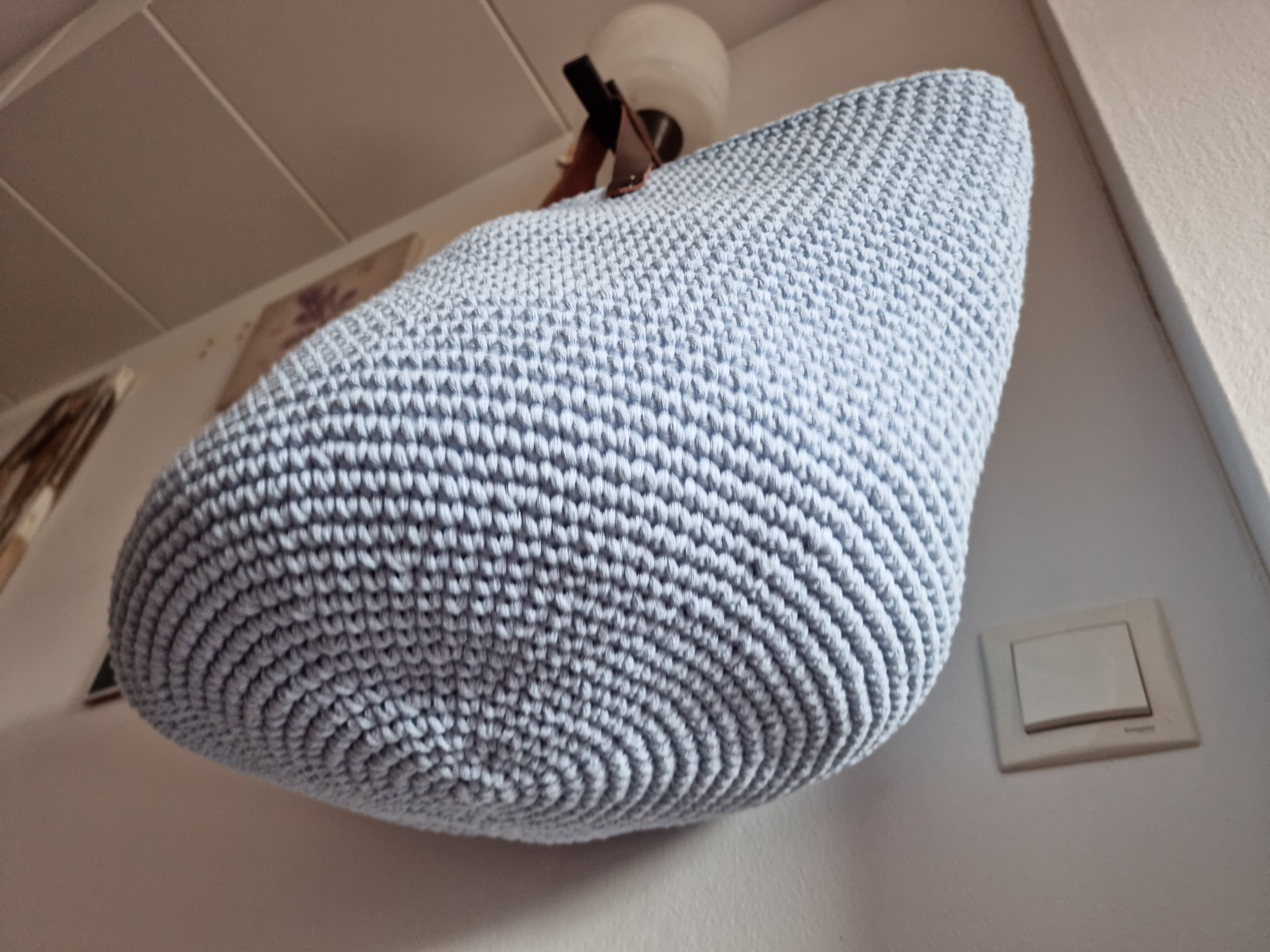 Ręcznie robiona ze sznurka bawełnianego 3 mm, z okrągłym dnem (38 cm) i szerokością u góry aż 60 cm – pomieści absolutnie wszystko.